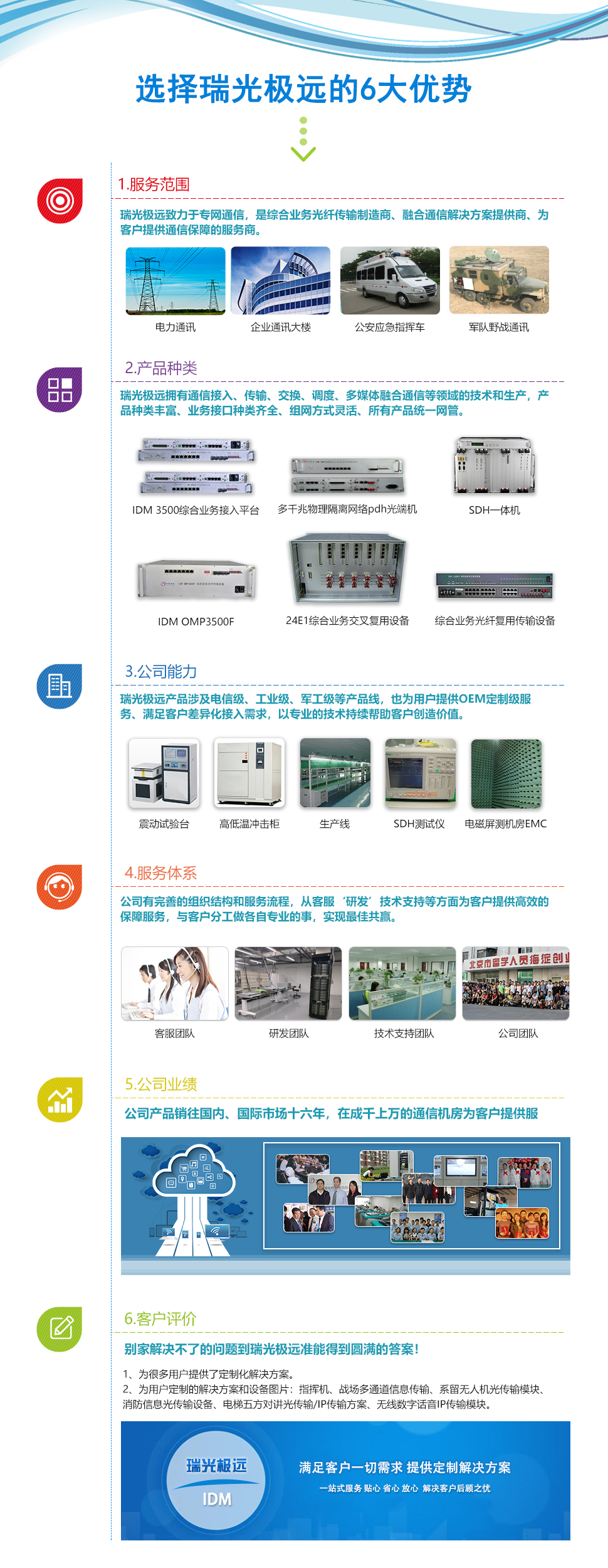 瑞光極遠(yuǎn)北京瑞光極遠(yuǎn)數(shù)碼科技有限公司(瑞光極遠(yuǎn))產(chǎn)品包括通信接入,傳輸,交換和多媒體指揮調(diào)度四大系列。自主研發(fā)的IDM設(shè)備包括:電話(huà)光端機(jī)sdh電話(huà)光端機(jī)SDH光端機(jī)千兆網(wǎng)光端機(jī)PCM設(shè)備SDH設(shè)備五方對(duì)講光端機(jī)、音頻光端機(jī)、光電一體化設(shè)備、光纖復(fù)用領(lǐng)域、光纖傳輸設(shè)備、多業(yè)務(wù)光端機(jī)、綜合業(yè)務(wù)復(fù)用領(lǐng)域、綜合接入設(shè)備、武警光端機(jī)、音視頻交換領(lǐng)域以及軟交換領(lǐng)域都深有研究。
