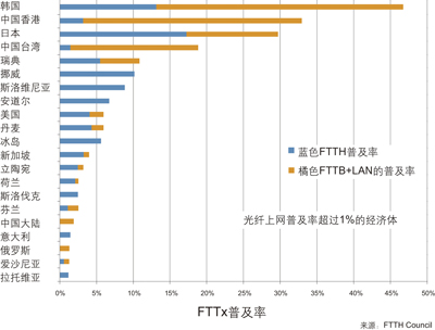 2009年6月全球光纖上網(wǎng)普及率超過(guò)1%的經(jīng)濟(jì)體(國(guó)家和地區(qū))已增加到21個(gè)。在全球光纖上網(wǎng)普及率排名方面,亞太地區(qū)仍然引領(lǐng)全球占據(jù)前4名。2009年上半年韓國(guó)普及率超過(guò)46%,位居第1名。中國(guó)香港、日本分別以約33%、約30%緊追其后,中國(guó)臺(tái)灣則以約19%穩(wěn)居第4名,其次是北歐國(guó)家瑞典和挪威等地,中國(guó)大陸排名十六(參見(jiàn)圖1)。而且其中挪威、斯洛維尼亞、安道爾、冰島、荷蘭、斯洛伐克、意大利和拉脫維亞等國(guó)基本上發(fā)展的全部是FTTH。