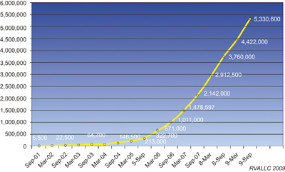 RVA市場(chǎng)研究機(jī)構(gòu)在FTTH委員會(huì)的Houston會(huì)議上指出,北美的FTTH依然在健康發(fā)展,至2009年9月已經(jīng)有1720萬(wàn)個(gè)家庭有光纖經(jīng)過(guò),占北美家庭數(shù)的15%。而簽約使用光纖接入的用戶超過(guò)530萬(wàn),一年來(lái)增加了150萬(wàn)用戶。2001年至2009年北美FTTH用戶發(fā)展的情況可參看圖3。