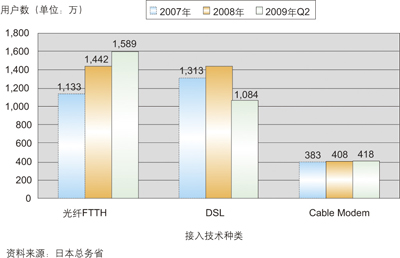日本是全球FTTH發(fā)展最早和最快的國(guó)家。根據(jù)日本總務(wù)省發(fā)布的信息,日本光纖(FTTH)用戶數(shù)2009年6月底約達(dá)1,589萬(wàn)戶(如圖2所示),與2008年6月底相比,約增加280萬(wàn)戶,年增長(zhǎng)率達(dá)21%。按這個(gè)速度推算,日本2009年底的FTTH用戶數(shù)可能達(dá)到1730萬(wàn)戶。