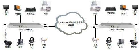 IDM VcodeE1可綜合接入控制鍵盤、IP網(wǎng)絡(luò)、顯示終端、電話機(jī)、擴(kuò)音器和麥克風(fēng)等多種調(diào)度終端,實現(xiàn)雙向視頻傳輸、語音對講功能。