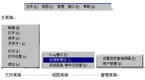 主菜單由文件、視圖、管理、窗口、幫助組成;文件菜單由新建、打開、保存、另存、打印、打印設(shè)置、退出組成;視圖菜單由Ping窗口(暫不能用)、資源管理窗口、系統(tǒng)信息/事件日志窗組成;管理菜單由設(shè)置定時(shí)查詢間隔(設(shè)定自動(dòng)刷新的時(shí)間間隔,單位為`10秒)、用戶管理(管理用戶權(quán)限,超級(jí)用戶可增刪用戶等,其它用戶無(wú)權(quán)使用)。
